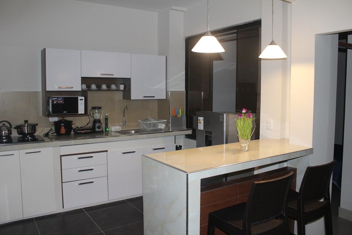 Apartamento de dos dormitorios en segundo piso. 1. En primer dormitorio cuenta con aire acondicionado, cama de dos plazas, smart tv, armario y velador. 2. El segundo dormitorio tiene ventilador, cama de plaza y media, camarote o litera y smart tv. Sala comedor totalmente amoblado, ideal para que prepare sus alimentos. 3. Áreas comunes (piscina, lavadero/terraza).