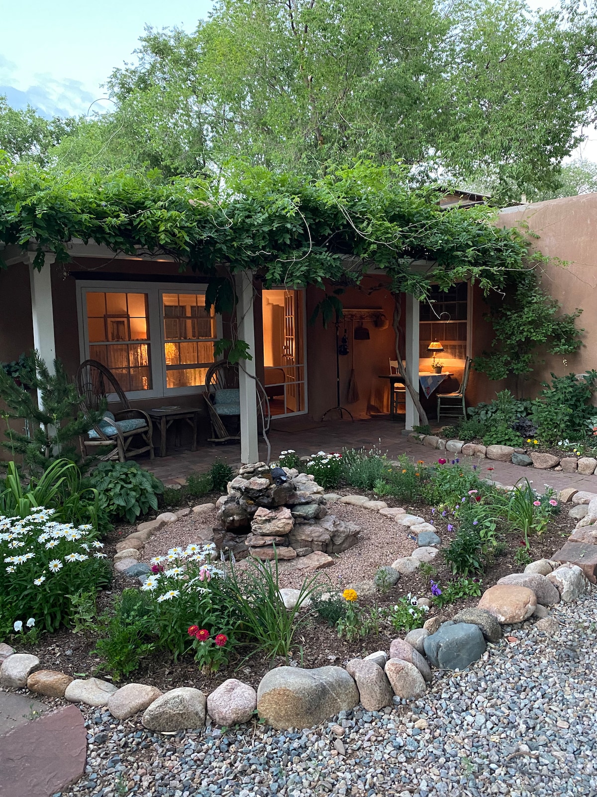 At the end of a private quiet drive you will be surprised at the quintessentially vintage casita, Situated in a delightful garden. You are in the heart of Canyon Road, Santa Fe's famous gallery destination, within walking distance to everything, the best restaurants, museums, galleries, and shopping. The Casita is good for couples, solo adventurers, personal retreats. With advanced notice we would love to accommodate one small, under 15 pounds, well behaved pet, - no kitties. no puppies.