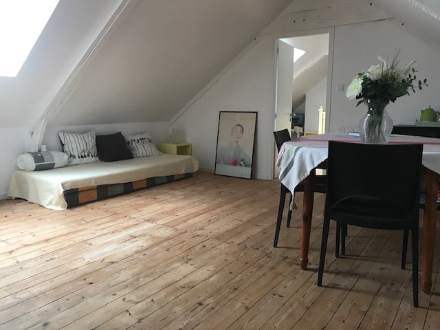 Chambre mansardée à l'étage de ma maison, dans un quartier résidentiel à 10 minutes de Guidel Plage et 15 minutes de la gare de Lorient. Commerces à proximité et ligne de bus dans le quartier. Lit de 160, possibilité de rajouter un lit bébé et/ou un matelas pour enfant (5€ supplémentaire). Salle d'eau privée à côté avec WC. Accès au jardin, wifi, jeux de société. Petit déjeuner (6€ par personne) sur réservation. Cabinet de massage sur place, sur réservation. Animaux sur demande.