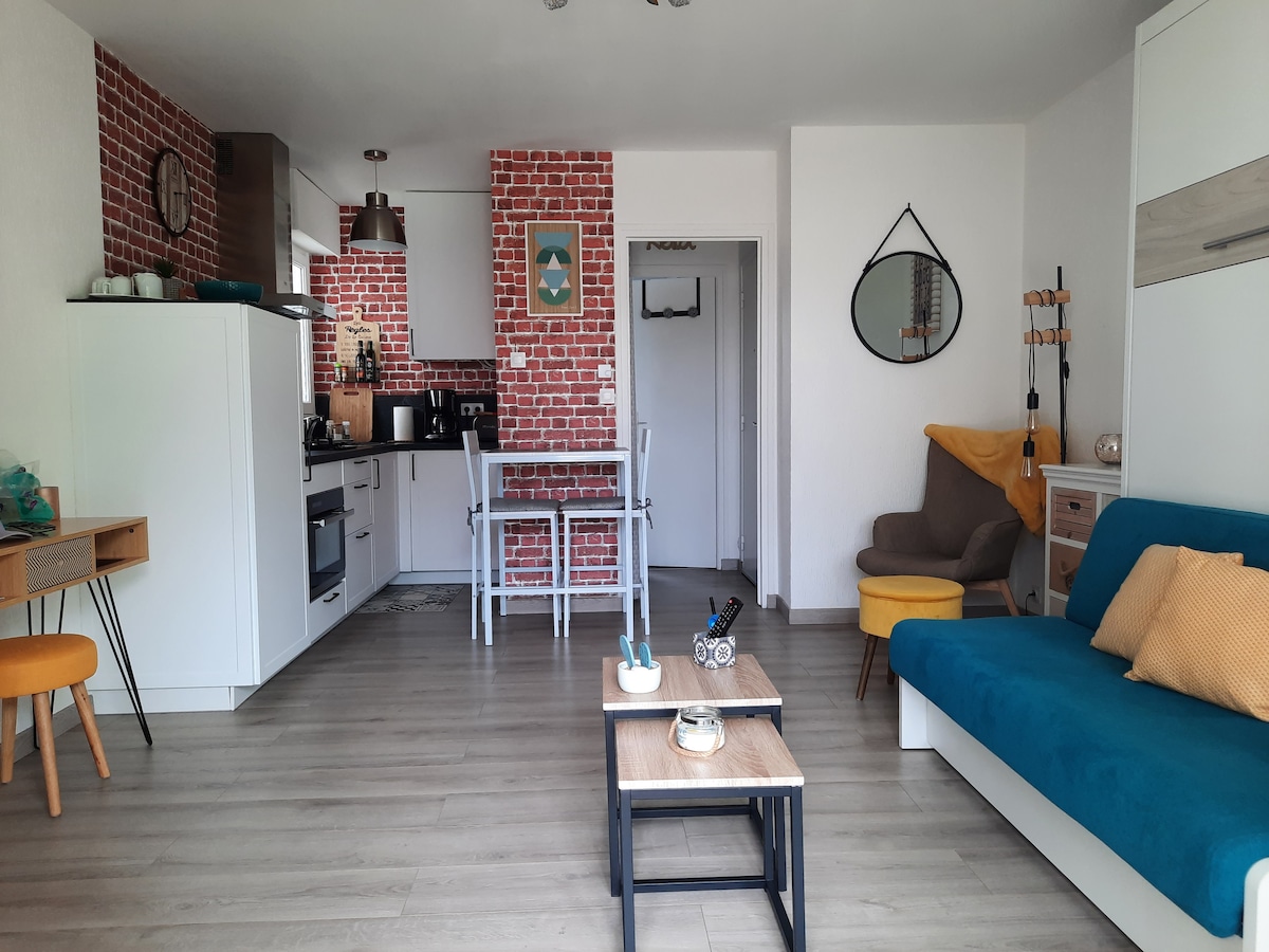 Situé au 1er étage d'une petite résidence, cet appartement lumineux de 40 m2 avec vue mer est composé de : - séjour avec clic-clac, - kitchenette équipée ( micro ondes, mini four, frigo, cafetière , grille pain ....) - salle d'eau avec douche, - chambre avec lit de 140, - penderie et placards. Une terrasse de 9 m2 offre une vue panoramique sur la mer et l'embouchure de la Laitä. Parking gratuit, supérette à 50 mètres, boulangerie, restaurants et laverie à proximité.