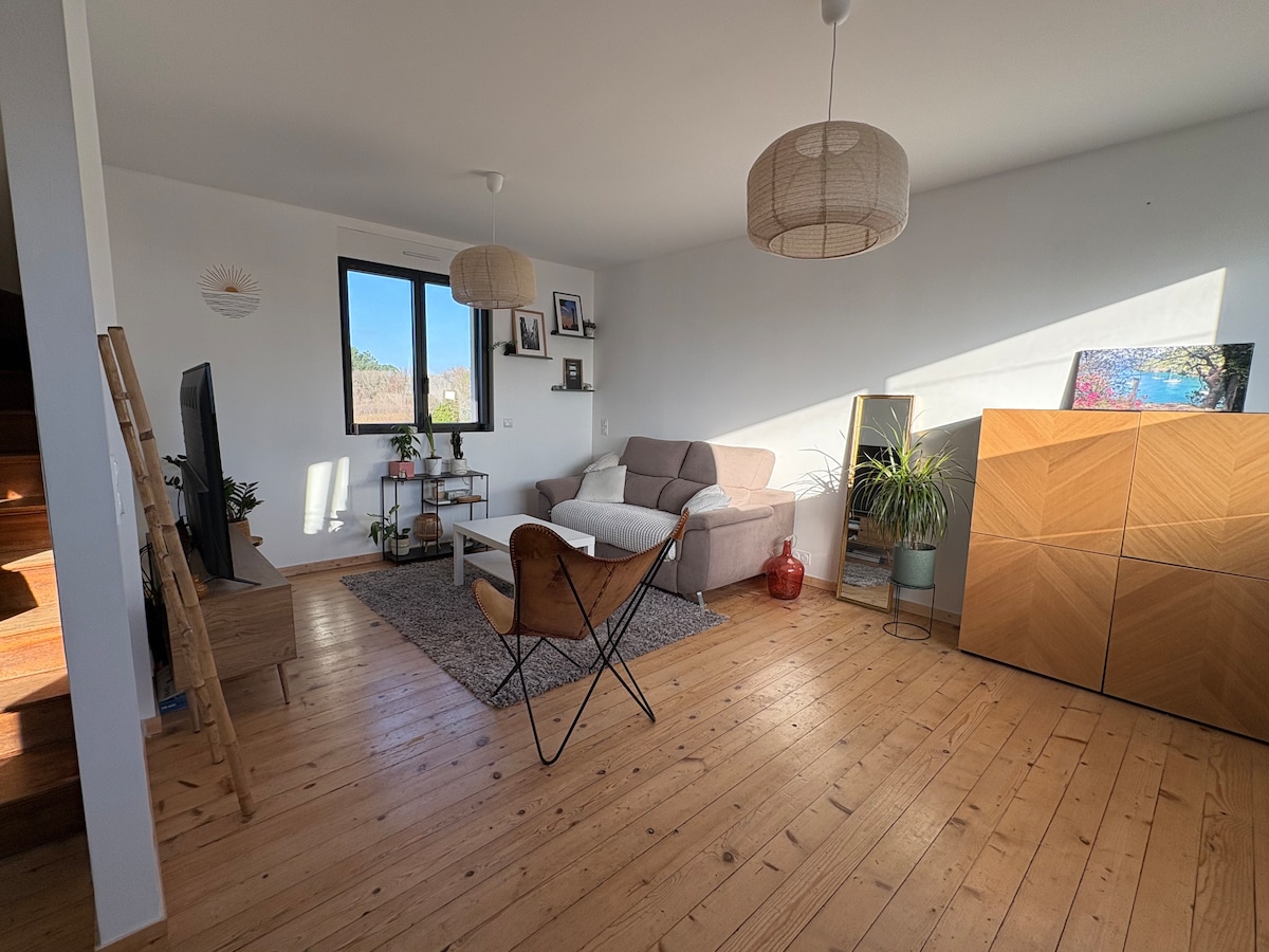 Situé en Morbihan sud, à l'entrée du golfe du Morbihan, notre est gîte composé d'un bel espace de vie avec cuisine, séjour et salon, de 2 chambres ( 1 lit de 160 et 3 literies de 80), salle d'eau et WC séparé.Terrasse exposée sud et jardinet privé et fermé. Espace parking privé. Un espace détente, en commun avec un gîte mitoyen ( mais qui devient privatif quand vous l'utilisez) avec sauna infrarouge, spa extérieur et équipements de sport ( vélo et rameur) est à votre disposition.
