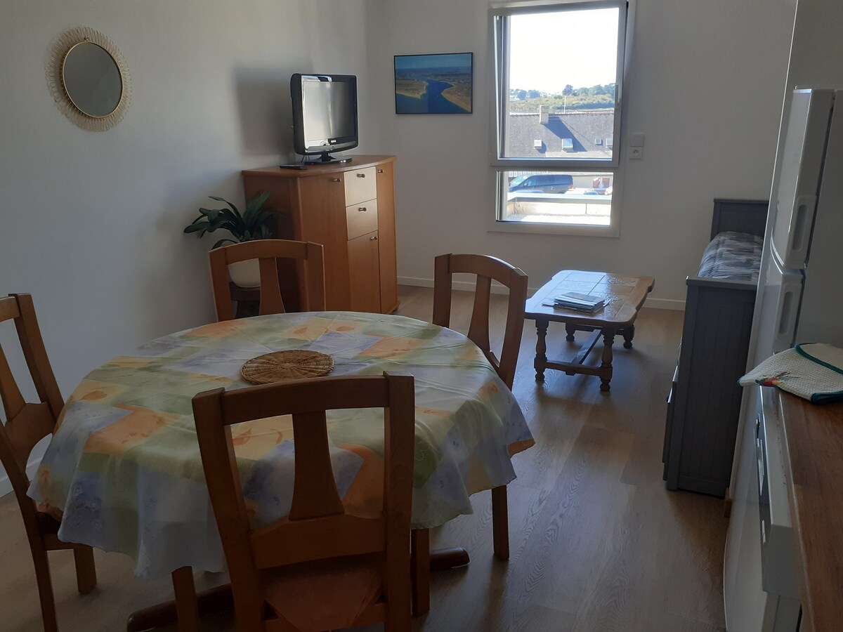Très lumineux, situé à l'étage d'un pavillon neuf ce logement tout équipé et climatisé avec une belle vue sur la Ria d'Etel,comprenant une cuisine séjour de 20 m² avec un canapé lit confortable ,une chambre individuelle de 12 m² avec salle de bains 8 m² attenante ,TV dans le séjour et la chambre ,prises internet, activités Plongées sous marine ,plage,sentiers côtiers,pêche,ballade en bateau,à 100 m du port Niscop son bar et le restaurant Sous le Pont,la grande plage de kerhillio 8 km, ST Cado