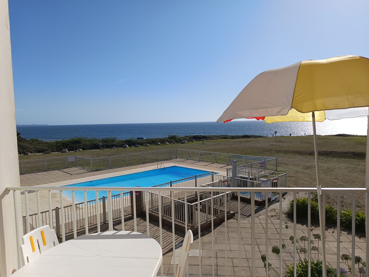 FACE OCÉAN pour ce charmant T2 de 27m2 qui vous attend au 2ème étage d’une petite résidence. Sa situation exceptionnelle vous permettra de profiter, au calme, d’une vue imprenable ! Vous apprécierez son parking privatif. IDEALEMENT SITUE, toutes les commodités sont à proximité immédiate. Le littoral sauvage, ses superbes plages et ses randonnées commencent au pied du logement . Assurez vous de bien lire toute l'annonce pour modalités et au plaisir de vous recevoir en Bretagne Sud !