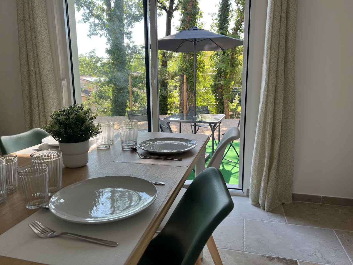 Belle appartement indépendant refait à neuf dans villa privé. L'entrée se fait par un petit portillon qui donne sur ma terrasse, l'appartement se trouve à l'arrière de la maison. Vous y trouverez une cuisine équipé donnant sur le salon avec canapé et TV et vu sur une terrasse privative au logement. Une grande chambre avec placard intégré, une salle de bain avec baignoire et toilette séparé. Avignon: 20 min Dentelles de montmirail: 15 min Parc Spirou: 10 min