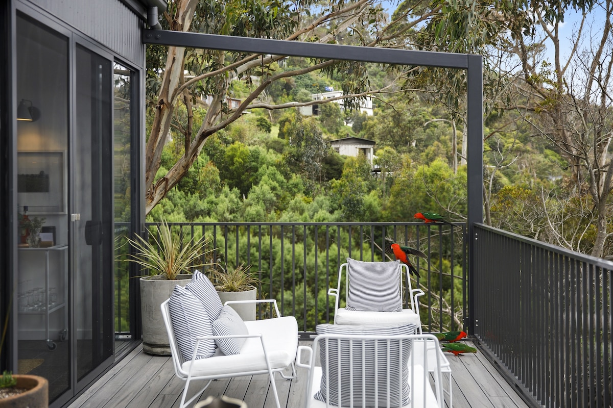 Our cottage is located on the edge of the beautiful Otway National Park yet only 5 minutes from Lorne, the best of both worlds. Relax on the deck and take in the sweeping views across the forest to the ocean and the odd visit from King Parrots and Cockatoos You’ll have everything you need including linen, basic pantry supplies, streaming services, wifi and in winter firewood We are located on acreage with other similar cottages close by. Our cottage is freestanding, private and very peaceful