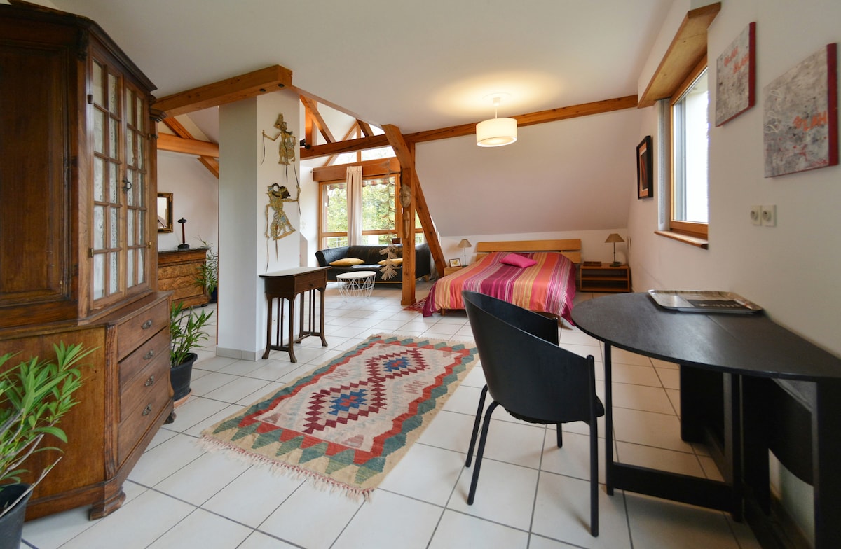 Belle chambre refaite à neuf avec parquet ancien restauré pour un séjour reposant aux portes de Colmar et proche des attractions touristiques de la région. Linge de lit, serviettes de toilettes, petit déjeuner fait maison et wifi (fibre) inclus dans le tarif, ainsi que le guide de nos bonnes adresses locales ! 😉 Accès facile par les grands axes et la gare. Stationnement gratuit juste devant la maison. Eguisheim à 5min, Colmar à 10min, Mulhouse à 30min, Strasbourg et Europa Park à 1h.