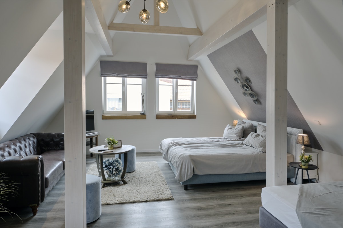 The Duplex Suite gives you a pleasant feeling of space, with its 52m² and 2-level layout. It has 2 beds and 3 extra beds for up to 5 people, large bay windows opening onto the balconies, and an Italian shower and toilet in the bathroom on the 1st level, as well as a shower room and toilet on the 2nd level.