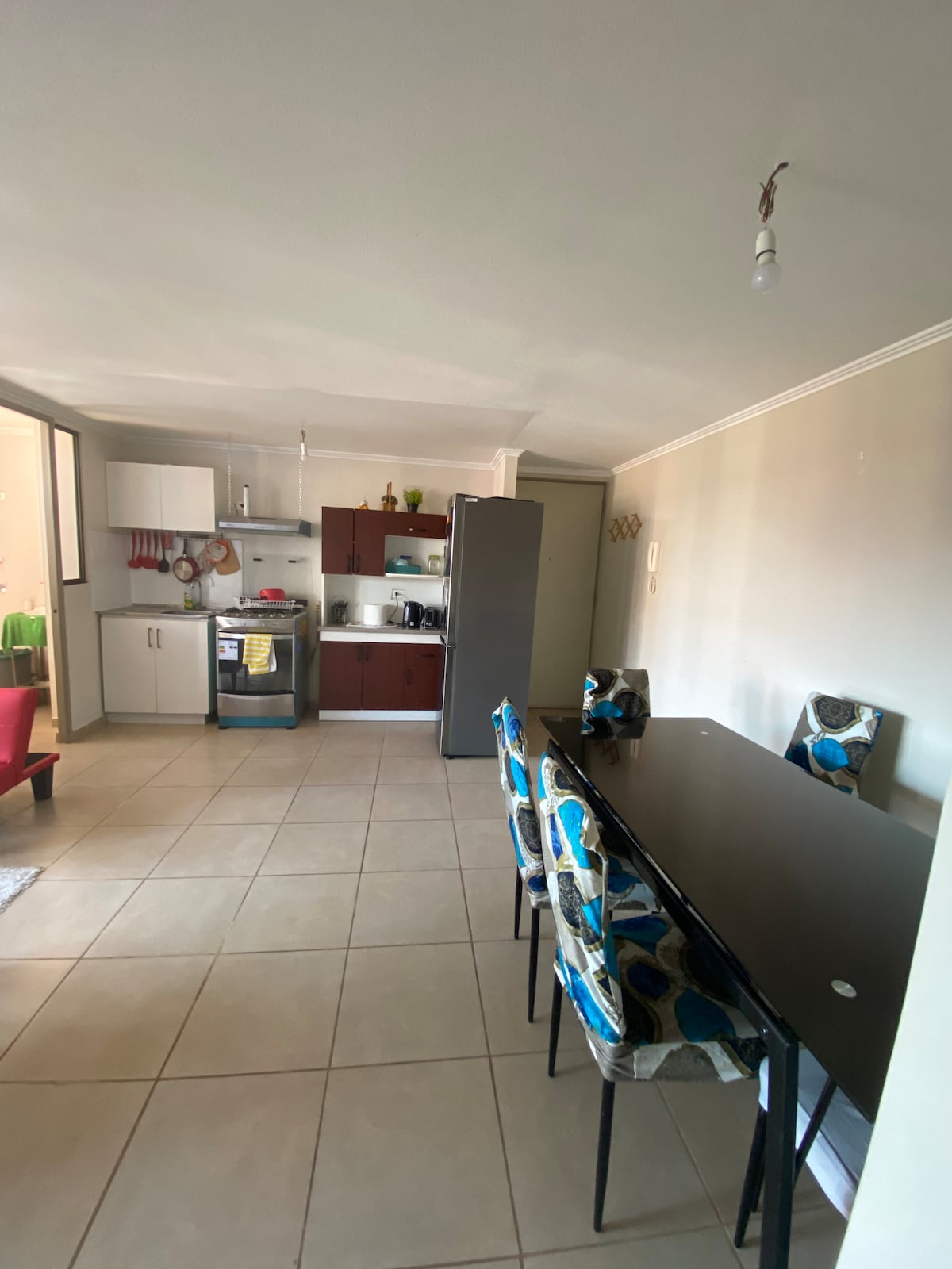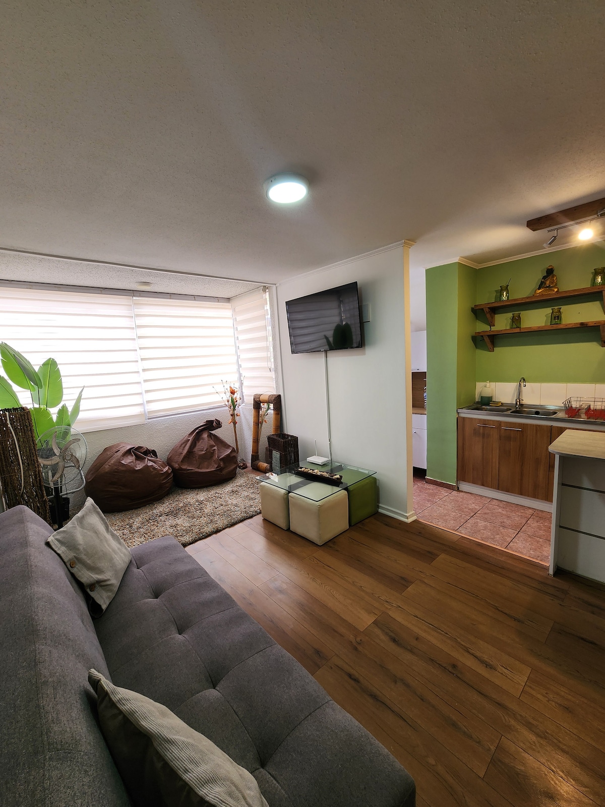 Tu familia estará cerca de todo en este alojamiento céntrico. Departamento luminoso con vista a la cordillera, ideal para tres personas. Cuenta con cama de 2 plazas, sofá cama, baño y cocina equipada. Además, tiene TV, terraza y acceso a piscina, sala de estudio y más. A solo dos cuadras del supermercado, a minutos del centro comercial y a 50 min de la capital. ¡Perfecto para una estadía cómoda y conectada!