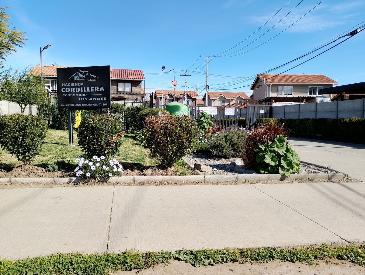 Hermosa Casa ubicada a 5 minutos del centro de Los Andes, en sector residencial, 2 dormitorios y 2 baños. Dormitorio 1: Cama matrimonial y baño en suite, TV. Dormitorio 2: 1 Cama nido (es decir 2 camas) de 1.5 plazas y TV. Cocina totalmente equipada con utensilios de cocina e insumos básicos como sal, aceite, azúcar etc. Se incluye ropa de cama, toallas, Jabón, shampoo y papel para todos los huéspedes. Cuenta con wifi y tv cable. Parrilla a carbón y espacio exterior dnd se puede compartir.