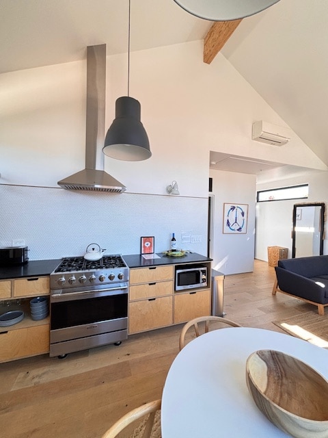 Enjoy this modern, light filled loft-style haven with high ceilings and expansive glass walls. Prepare meals in the beautiful kitchen with top-of-the-line appliances and kitchenware. Completed in 2017, this Bauhaus-inspired guesthouse was featured in GQ "Best Airbnbs in Los Angeles" list. Powered by solar panels, it offers a spacious open floor plan, private deck, and keyless entry. Rest assured, we're nearby to ensure your comfort. Experience modern luxury in this sun-drenched guesthouse.
