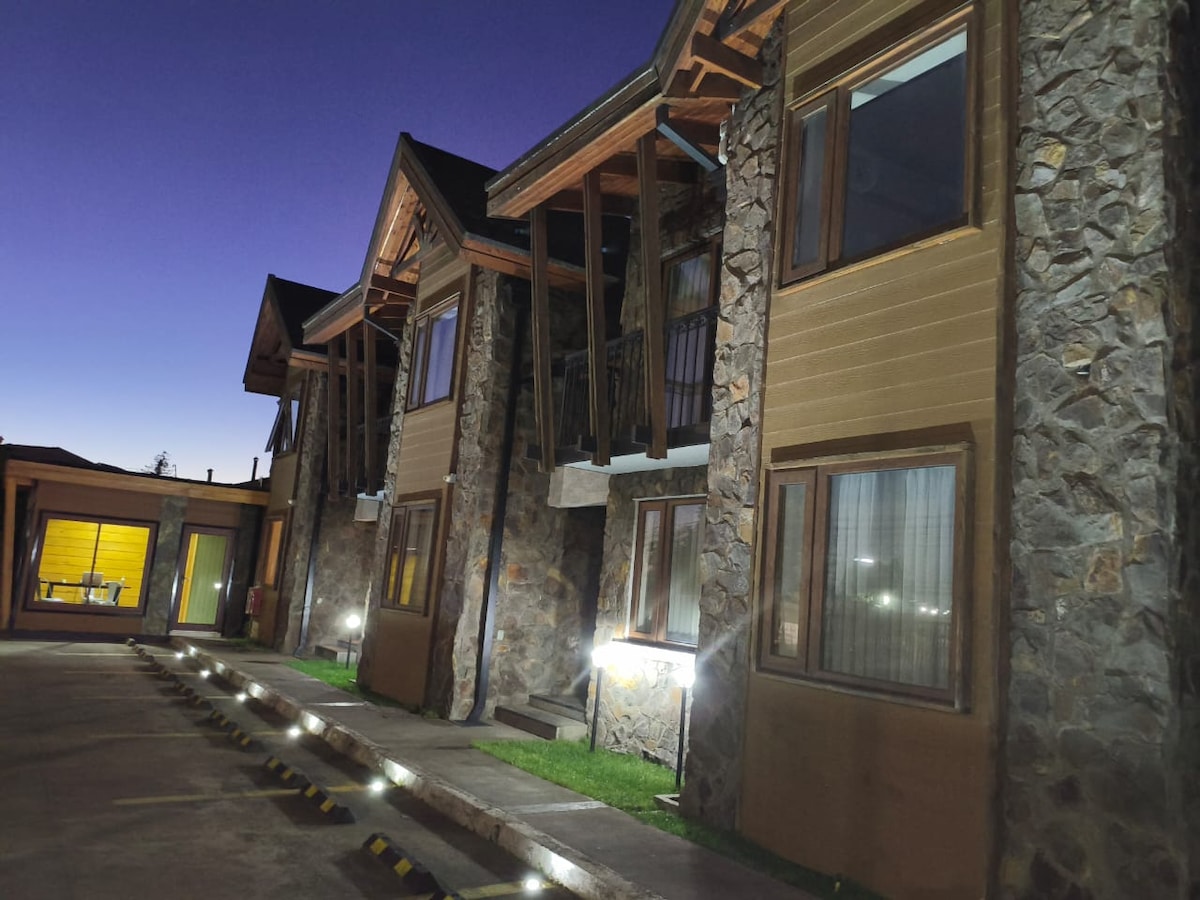 Pequeña cabaña familiar (45mt) en parcela , completamente independiente, 2 dormitorios, 2 baños, estar-comedor, cocina muy equipada para 4 personas. Aire acondicionado y estufa a pellet para calefacción, TV y WiFi. A solo 1 km de la zona urbana, almacén y restaurantes. A 3 km de terminal de buses y supermercado Líder. Muy fácil llegada desde antigua carretera norte-sur o Avenida Las Industrias, principal llegada a la ciudad. Si tu viaje es al norte o al sur, solo te desvía 2 km. de tu ruta.
