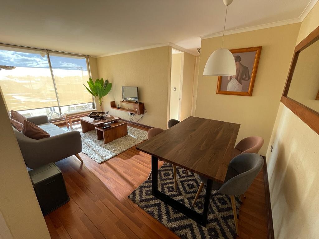 Departamento nuevo, full amoblado y decorado!! a pasos del terminal de buses y locomoción colectiva Sector tranquilo y residencial Ubicado en piso 7 Dormitorio Principal (1 cama matrimonial) baño en suite y balcón Dormitorio 2 (1 cama divan de 1,5 plazas) Dormitorio 3 (1 cama 1 plaza) 1 segundo baño Comedor con cocina integrada Living con Tv y balcón Lavadora - Secadora Vajilla completa para 5 personas Todo nuevo y excelente calidad Estacionamiento incluido