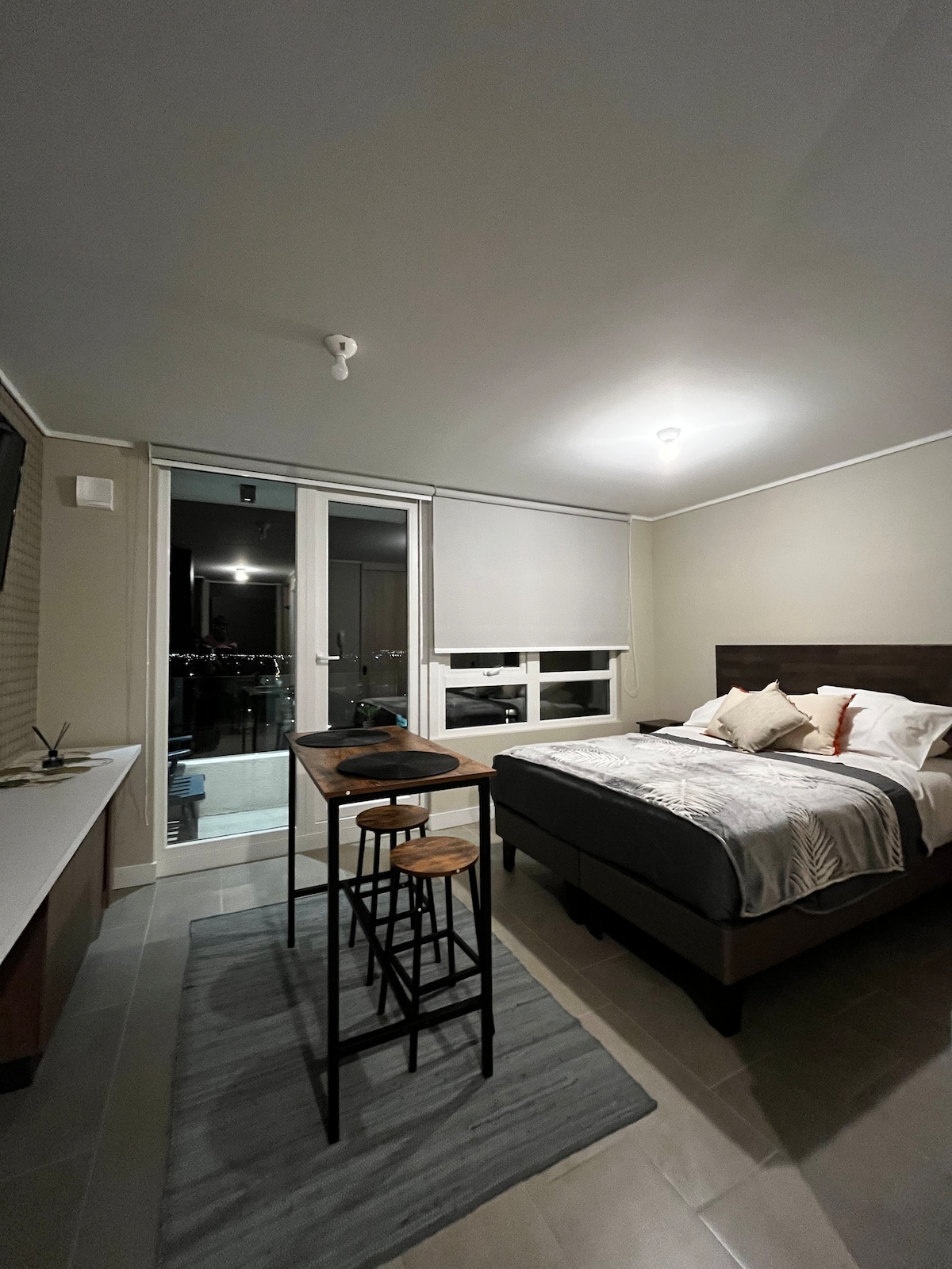 Disfruta de una estadía inolvidable en nuestro Airbnb. Nuestros servicios incluyen: Wifi, aire acondicionado, sábanas y toallas. Estacionamiento subterráneo, área de juegos infantiles. Ubicado cerca de supermercados, clínica, pubs, restaurantes y a 5 minutos del terminal rodoviario en auto. Locomoción colectiva a media cuadra.