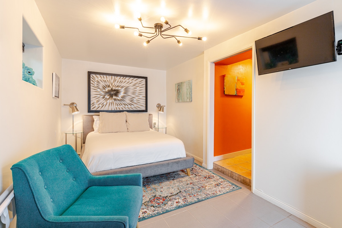 Live like a legend in this bold, high-ceilinged DTLA loft, unlike anything you'll find elsewhere! Deep blue walls, floor-to-ceiling curtains, and a gallery wall of over 30 music icons create pure Rock ’n’ Roll Green Room Chic. Gold and satin textures glam up the bedroom like you’re in your own backstage dressing room, while a sleeper sofa adds extra comfort. Smart tech, 360° rooftop pool, full kitchen, in-unit laundry, and free secured parking complete your ultimate downtown experience.