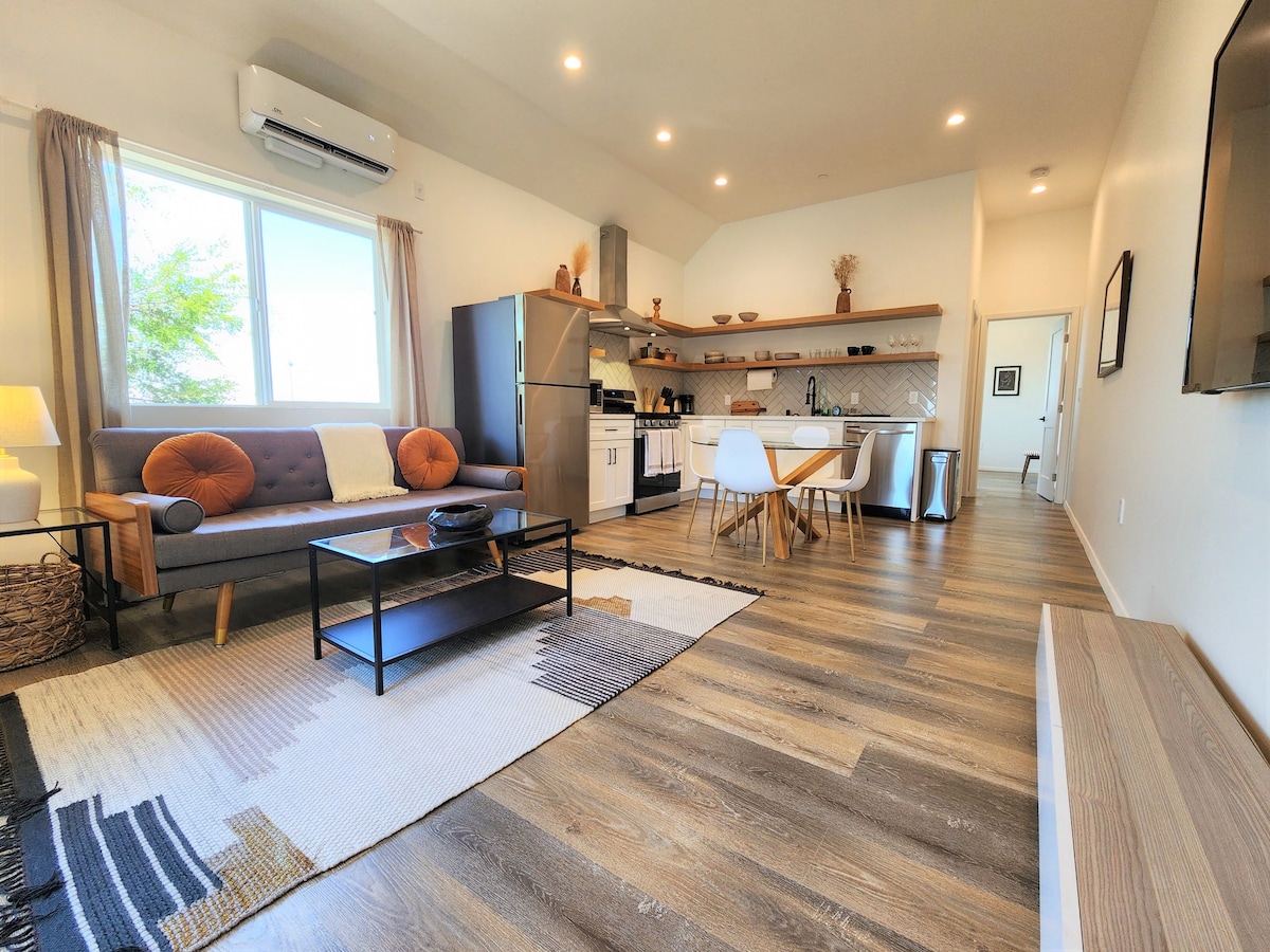 This modern loft is within walking distance to downtown's best bars and restaurants. It's also less than a mile from crypto dot com arena. The location even offers fast access to Dodger Stadium, The Greek, and Banc of California Stadium. Inside, is a large space with vaulted ceilings. Between the King bed in the bedroom and the sleeper sofa in the living room, up to 4 adults can sleep comfortably. 2 big screen TV's. One in the living room and one in the bedroom (which has a moveable stand).