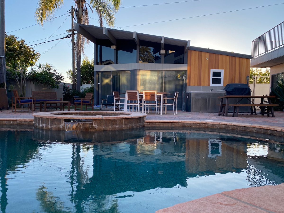 Local touches abound inside this cozy guest house. Yard is complete with seating and fire pit, relax and enjoy a glass of wine or soak away the day in the hot tub! This guesthouse is a quaint and comfortable stop for travelers looking for value and convenience in a safe neighborhood. Located close to SoFi stadium, Disneyland, Long Beach airport and LAX and with many great restaurants to choose from. The house is also just a short drive to the beach and downtown Long Beach.