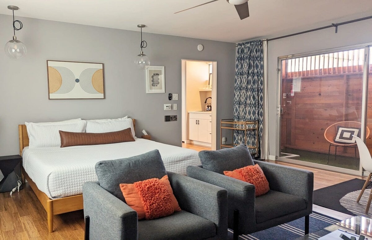 SPECIAL WINTER PRICING. This spacious private oasis, with a secure gated entrance and private secluded patio, is a perfect refuge for travelers needing a clean, quiet place to stay. The light, airy room with a Mid-century vibe, fast Wi-Fi, and Smart TV makes a perfect home base for exploring Venice, Santa Monica, Malibu, and points beyond. Stroll along Abbot Kinney, dip your toes in the blue Pacific Ocean, watch the sunset at the beach. Come and enjoy Venice like a local.