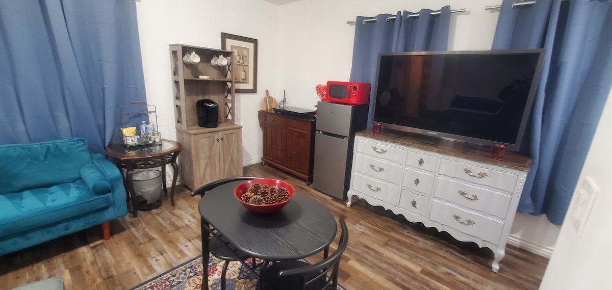 Welcome to our brand new private studio. This tiny studio is perfect for a solo traveler. It has a private entry and is located behind a 1940 historical home in a quiet safe neighborhood. It has a sparkling clean bathroom and a kitchenette(no stove). The kitchenette has a mini fridge, microwave, toaster oven, electric kettle, and single brew coffee dispenser. The space is for a single guest and furnished with a high quality twin size bed , a full size table, and a full size chest drawers.