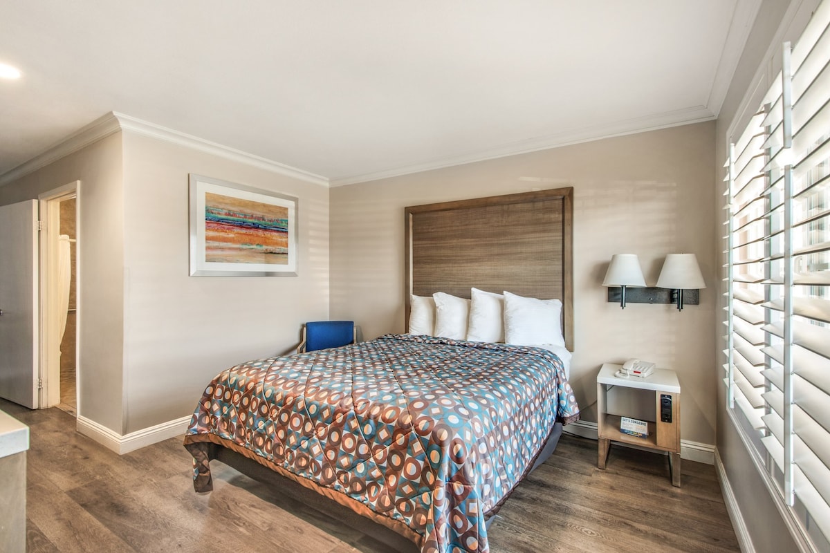 Boutique-style room near Disneyland®! Enjoy a clean, modern space with 1 Queen bed, private ADA-accessible bathroom available upon request, free Wi-Fi, and free parking. Designed for comfort and convenience, with accessibility features to ensure every guest enjoys a seamless stay. Walk or rideshare to Disneyland® Resort or the Anaheim Convention Center. As an authorized Disneyland® Ticket Seller, save up to $25 on multi-day park passes.