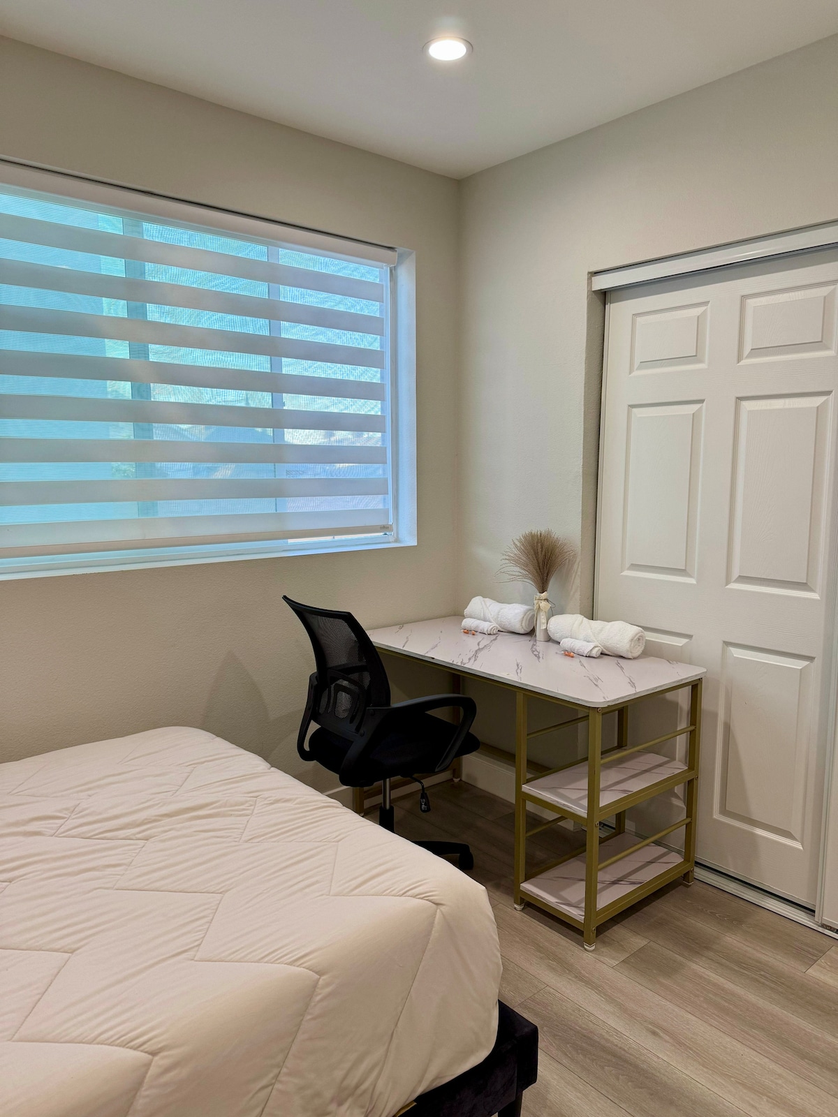 This is an addition to the main house with private entrance at the side. It is fully independent from the main house with kitchen, toilet/shower and washer/dryer. It comes furnished with king bed, wall mounted cable TV, small couch and dresser. Cox high speed wifi is available. There is a door slider that separates the casita from the main house. You can keep this locked. You will also have access to the back yard with pool/jacuzzi, bbq, etc. Great place to just kick back and enjoy.