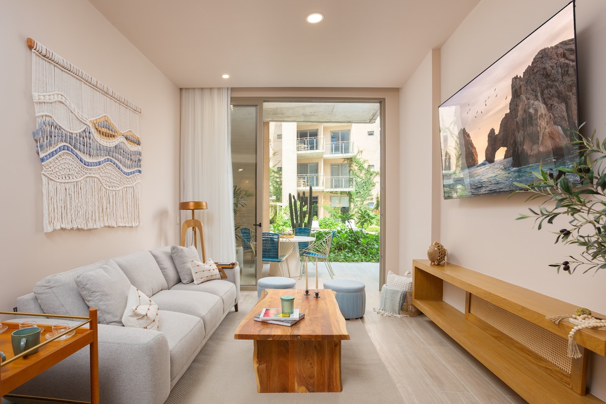Family-friendly and peaceful condo with a perfect location near restaurants, bars, cafés, banks, supermarkets, and nightlife. Just a 15-minute walk to the Cabo Marina. Newly furnished with carefully selected pieces, 70” TV in the living room and 60” TV in the bedroom. Fully equipped kitchen and beach supplies. A beautiful space to enjoy a relaxing and exciting travel experience in Cabo.