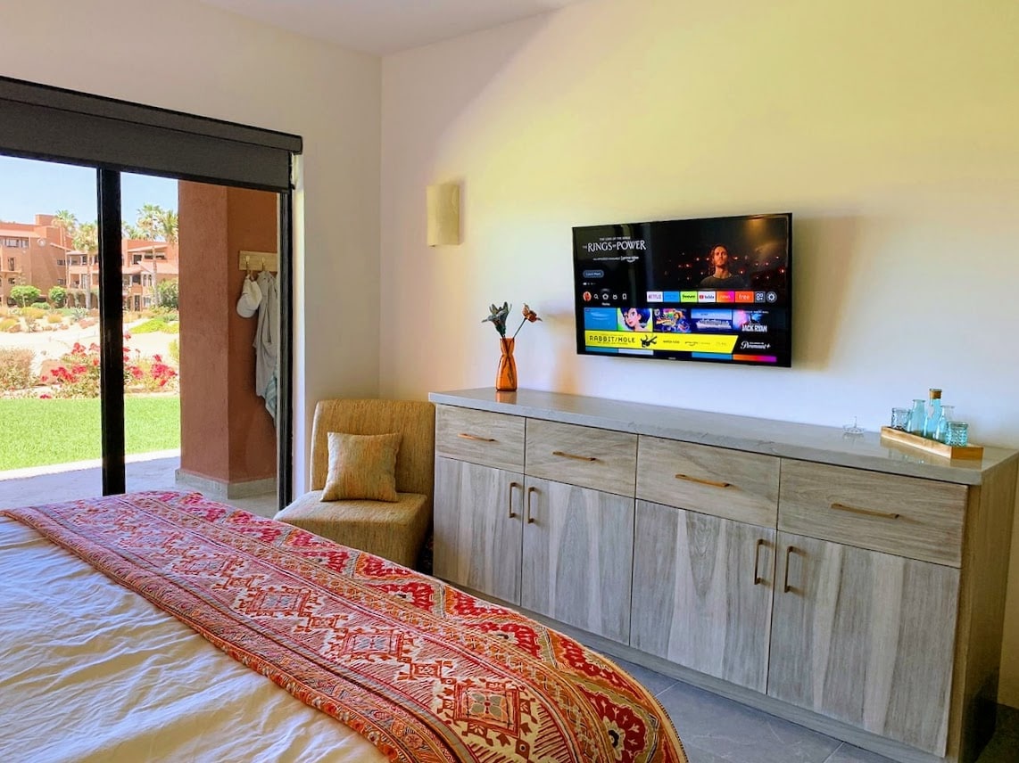 7305 Misiones Del Cabo Amazing views! To best understand this rental make sure you read our reviews. The living room features a queen bed leather sofa sleeper. Kitchen features new stainless steel appliances, granite countertops. In the bedroom you will find a very high end California King bed so comfortable its me tioned many times in our reviews. The bathroom features full tile walk in shower with a rain shower. Dual sink granite vanity with large mirror and warm lighting.