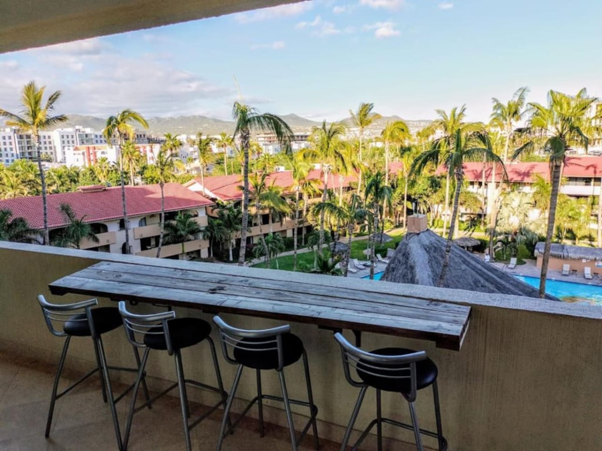 Welcome to our Beautiful penthouse condo, your Casa in Cabo! . Enjoy the pool and courtyard views from private balcony with BBQ. Living (smart tv) and dining areas great for entertaining. Fully equipped kitchen. 16 ft vaulted ceilings. MBR: full bathroom, one king size bed and one full size bed, smart tv. SBR: Two twin beds, arranged as a king size if needed, full bathroom. Laundry area. Condo perfect for couples, friends, and families...Mi Casa su Casa!