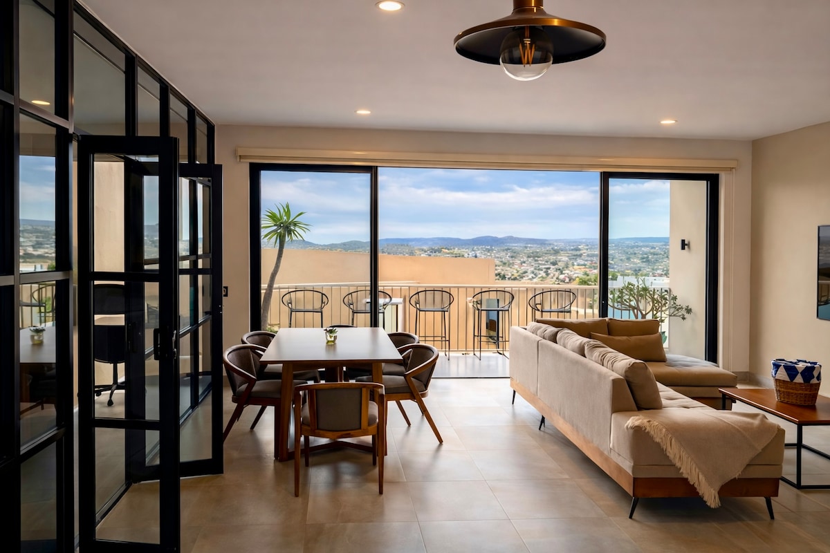 - Sweeping bay and Arch views from your private wraparound terrace: perfect for morning coffee or sunset cocktails. - Tennis courts, climate-controlled pool, and fully-equipped gym. - Two spacious bedrooms sleep 6 comfortably with a dedicated workspace, full kitchen, and in-unit washer/dryer. - Walk 5 min to Costco and Soriana for easy grocery runs or visit the marina restaurants and nightlife. - Reserve now for a serene retreat with all comforts and a welcoming host!