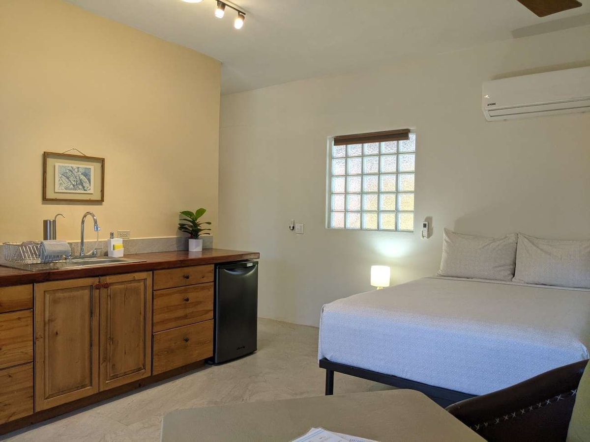 Small but spacious studio, ideal for solo travelers or couples.Kitchenette set up to cook simple meals, beach gear is provided: chairs, umbrella and towels. Located just a short 5 minute walk from dive shops, restaurants and swimming beach. Limited A/C is available and can be operated for up to 12 hours total including night time. A/C can be more limited on cloudy days. This unit sits on the same lot as Casa Mexicana and parking is next to the house. Not set for children under 8 years old.