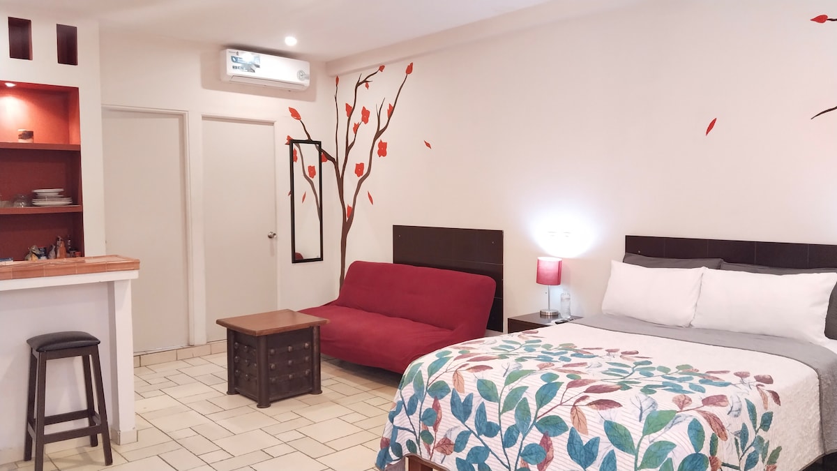 ✨ Spacious second-level apartment (220 sq ft) set in a lush tropical garden with over 40 fruit trees! Ideally located in the heart of downtown Cabo! Shops, restaurants and nightlife are all nearby! 5-min. walk to the marina and 15 min. walk to the beach 🏝️ ✅ Memory-foam mattress and blackout curtains for great sleep ✅ FREE private parking ✅ Private bathroom with amenities ✅ Private kitchen with appliances ✅ Complimentary coffee & tea ✅ TV featuring Netflix & YouTube ✅ In room safe