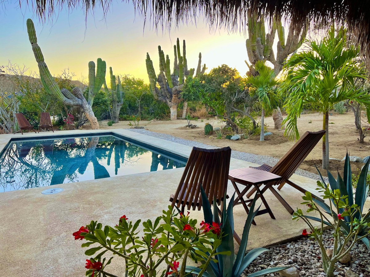 Think a short getaway or month(s) to rest/remote work or explore Baja. Open layout allows comfy lifestyle for just a couple yet can suit a gathering up to 10. -- Includes 3 bdrms + tiny bunk bdrm upstairs. + 5th separate studio bdrm on ground level with separate entrance. -- Well equipped kitchen, BBQ. --Large, level & very private patio & pool area. No shared spaces. --Ideal location. Beach, eateries, shops are all within easy walking 5 - 10 mins. Parking for 1 car only. Come and enjoy!