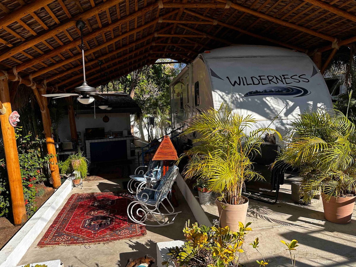 The studio is under a Palapa in the yard. I used to rent a motorhome there. There is an outdoor kitchen. The studio is new, built in 2023. If you need a place to sleep close to the beach and surf spots, then this might work. Check with me first if you have a pet.