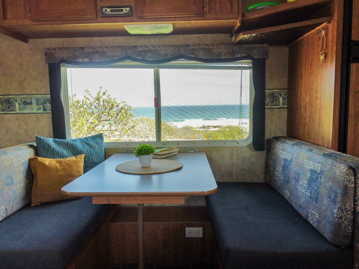 Reconnect with nature, Caribbean Ocean Views, unforgettable escape. East Cape Camper 3 remodeled Jayco Modern Design, New Furniture, Outdoor Patios, BBQ, Dining, and Gas Firepit, Ocean Views, Bathroom Separate from Toilet/Shower, Outdoor Shower, and Amazing Decor. 45 from San Jose Cabo Airport 10 min from Barilles and 5 minute walk to beautiful swimming beach, fishing, ATV, and snorkeling see cows at your window for dinner snorkel in crystal clear water , check us out EC Campers