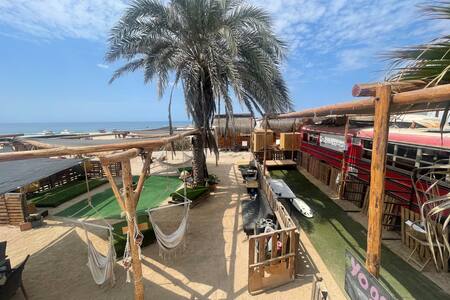 Our 40ft red school bus is in the best location in La Fortuna, right on the beach, in front of the break! With a queen bed, four bunks, kitchen, and lounge, it’s perfect for solo travelers, couples, or even groups of six. Chill in the hammocks at The Baja Station Café with margaritas and ocean views before hitting the waves. Stay connected with Starlink Wi-Fi, socialize in the cafe lounge and relax under a shaded palapa.