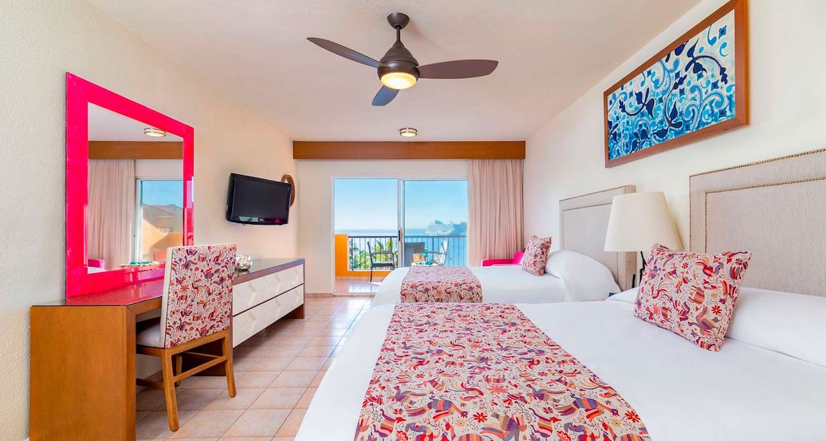 Hospédate en los mejores Resorts: en Pueblo Bonito Sunset Beach, gozarás de un entorno espectacular en el pacífico, aqui el clima es más fresco y disfrutaras de espectaculares puestas de sol y que mejor que acompañarte con servicio de socio Elite. Te ofrecemos una preciosa Junior Suite de lujo para 4 personas dentro del complejo turístico. La habitación: -2 camas queen o 1 KS -1 baño completo -Cocineta y para 4 personas -Cómodos sillones -Amplio balcón con vista espectacular