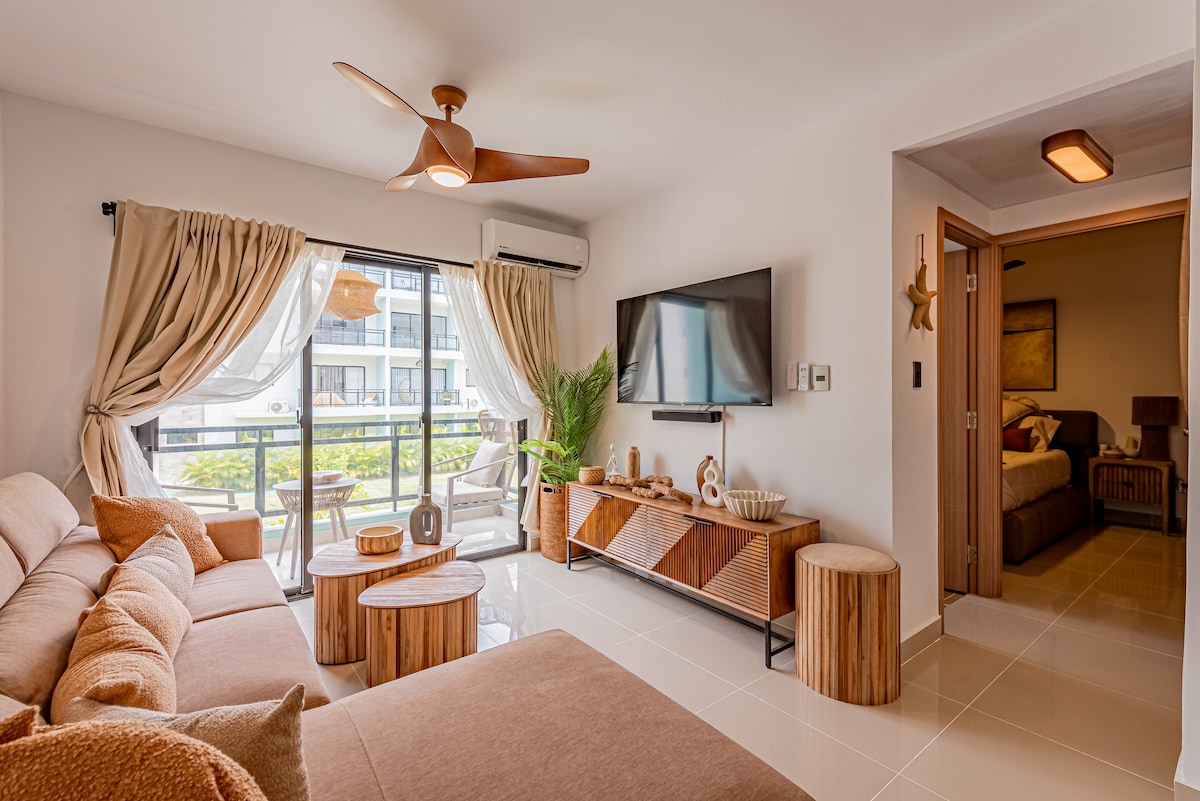 A guest favorite! Located in the heart of Bávaro, just a short walk from the famous Los Corales and Bávaro Beaches. Enjoy the convenience of having beaches, restaurants, supermarkets, and nightlife steps away—no transport needed. The condo features a shared pool, private terrace, Wi-Fi, A/C, and a fully equipped kitchen. Perfect for couples and digital nomads. Easy self check-in with a secure lockbox.