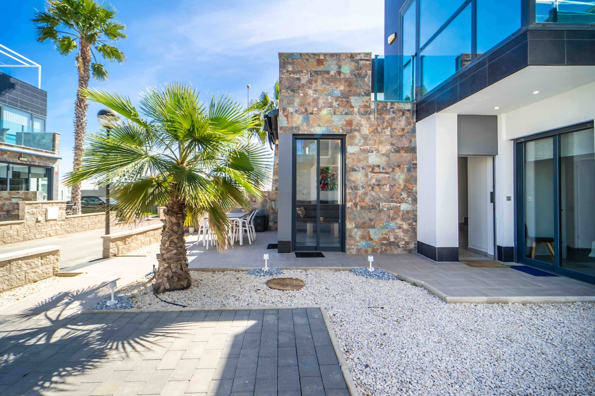 Modern villa with 152 m2 living space on site of 380 m2 with private pool of 50m2 (heating is optional) adjacent to a park and at 700 m from the beach of the Mar Menor. Equipped with central A/C, 5 bedrooms - one is also Game Room with PS 4, smart TV (UK ch.) and sleeping couch - 3 bathrooms (one has double rain shower), terrace with 2 big awnings, gas BBQ, 5 loungers, reclining chairs, 1 Gb Wifi, washer, dryer, safe, hairdryers, fully equipped luxury kitchen with dishwasher & American fridge.