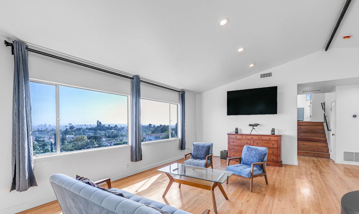 Your villa for your visit to LA, tucked in the peaceful Silverlake hills between Hollywood and downtown. Visit all the famous restaurants, shops, and culture of this hip upscale neighborhood, or stay home and renew your creative spirit, with artwork, piano, stylish modern blue swimming pool, spa, and sparking views in multiple directions of the downtown skyline, Silver Lake, the mountains. Beautiful sunsets daily. A quiet place for artists, writers, families, romance, and your rejuvenation.