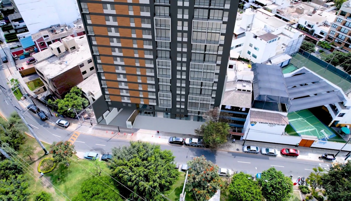 Apartamento nuevo, moderno, fresco, con vista y totalmente equipado. Cuenta con wifi, cable HD, lavadora, secadora y estacionamiento. Está ubicado en el oasis urbano más variado y seguro de Lima, ideal para viajes en familia, de negocio y placer. A pasos del Centro Comercial el Polo, restaurantes top, bares, cines y de la embajada de Estados Unidos. En las areas comunes encontrarás una piscina panorámica, zen garden, work space, functional gym y chill-out roof top. Relájate y Explora...