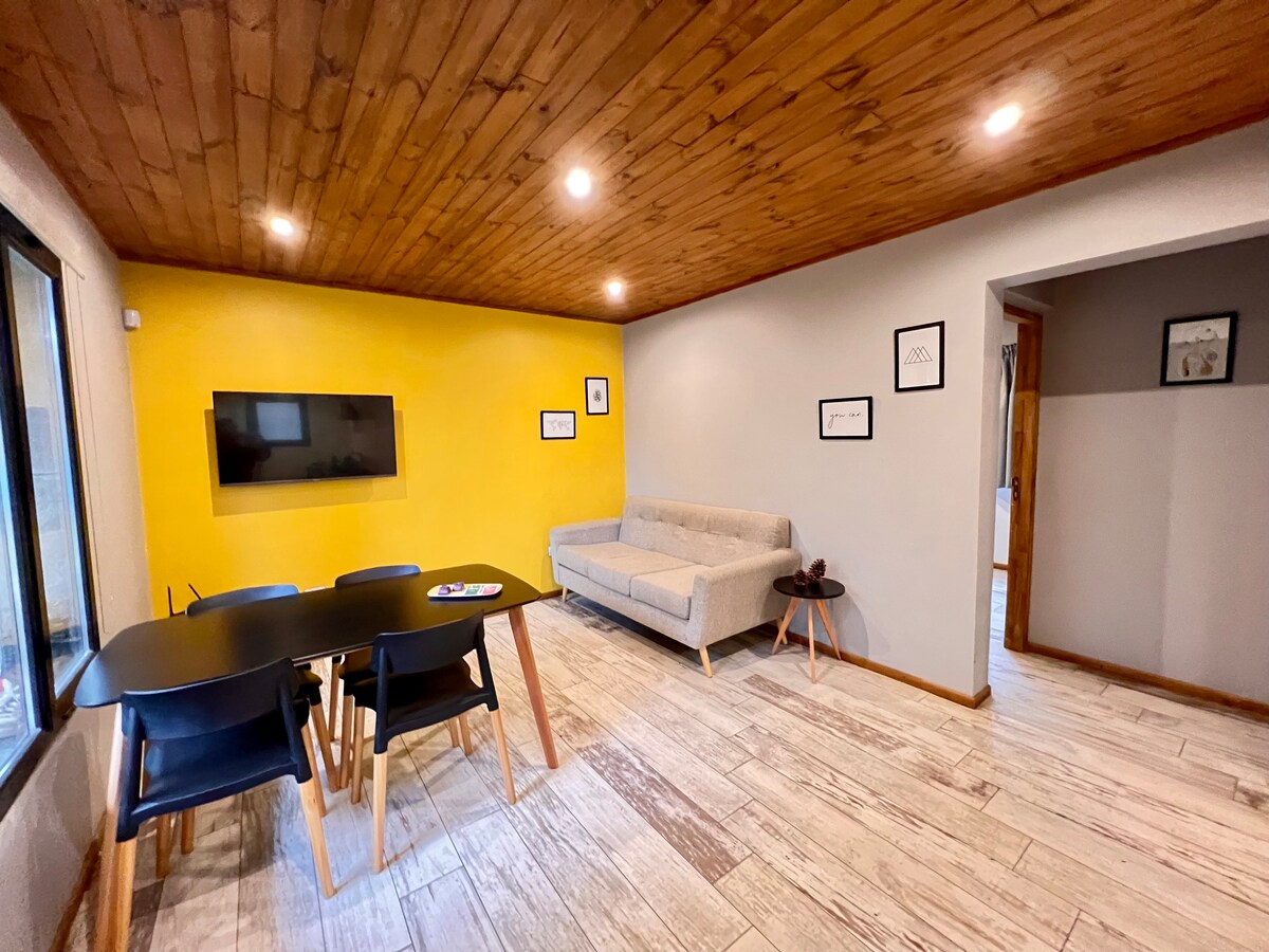 Departamento super equipado en el centro con vista a la montaña. Es un alojamiento tipo cabaña, cálido y moderno. Está en un segundo piso por escalera por lo que salir al balcón se siente casi como estar en la montaña. Estamos a 4 cuadras de la avenida principal del centro, se puede hacer todo caminando. Pero la calle es residencial y super tranquila. Tiene capacidad para 4 personas.