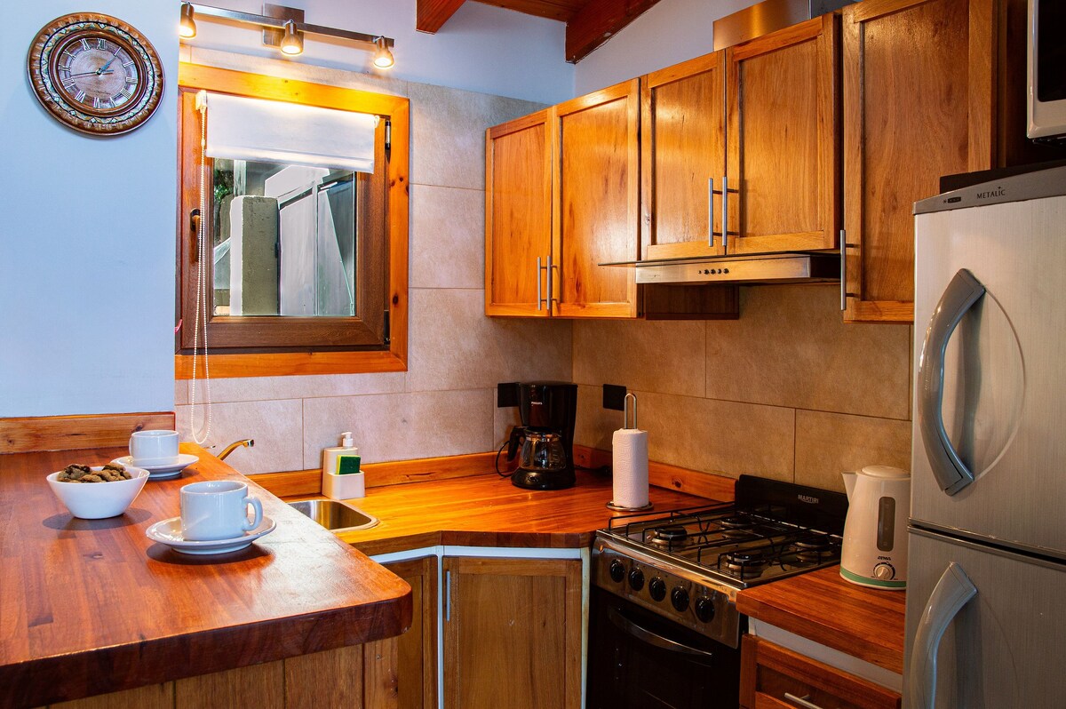 Andes cuenta con un ambiente amplio con cama matrimonial, sillón-cama, ropero y mesa. Dispone de una kitchenette muy bien equipada y un baño privado moderno y funcional. Posee acceso independiente. Incluye desayuno casero. Los huéspedes podrán disfrutar del parque con bellas vistas a los cerros, fogón y lugar para comer afuera. Desde la ventana se pueden apreciar los cerros enmarcados en la vegetación autóctona. El canto de los pájaros acompaña brindando una sensación de paz y armonía.