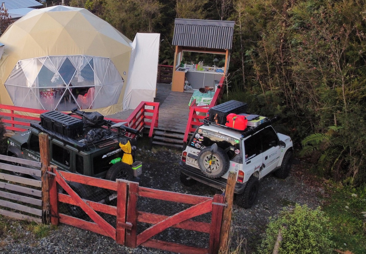 Glamping Domo en Hornopirén Te invita a disfrutar de un ambiente de tranquilidad y relajo en medio del bosque de Hornopirén y de una maravillosa vista al Volcán. Estamos ubicados en una parcela a 7 minutos del centro de la ciudad de Hornopirén, en la región de Los Lagos, comuna de Hualaihue. Contamos con Capacidad hasta 3 personas, televisión Diretv. Estacionamiento gratis. terraza y parrilla baño privado, con agua caliente.