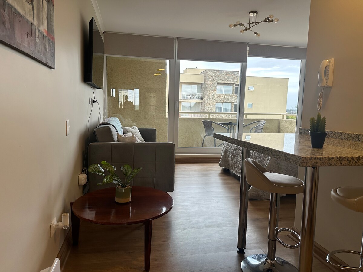 Un espacio pensado para sentirse comodo desde el primer día perfecto para difrutar de la ciudad, alojamiento céntrico, ubicación privilegiada cerca de los principales servicios, comercio, bomba de bencina, centros comerciales, restaurantes y supermecados, el departamento cuenta con cocina y equipamiento, incluyendo microondas y horno, tambien se incluye tv y wi-fi, ademas cuenta con balcón con vista a la ciudad, areas comunes, estacionamiento privado y servicio de porteria.