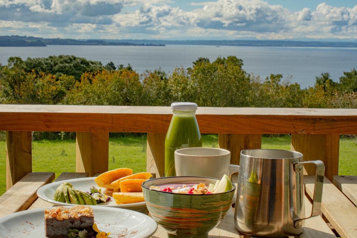 Boutique loft with panoramic views of Lake Llanquihue and the volcanoes, set in a peaceful natural setting in Frutillar. Ideal for couples, families or remote work stays. Just 5 minutes from Teatro del Lago and the waterfront, and 30 minutes from Puerto Varas. Features a private terrace for unforgettable sunrises, a grill, and an optional outdoor hot tub experience (additional fee). We look forward to welcoming you to Ave Lodge! Angela & Francisco.