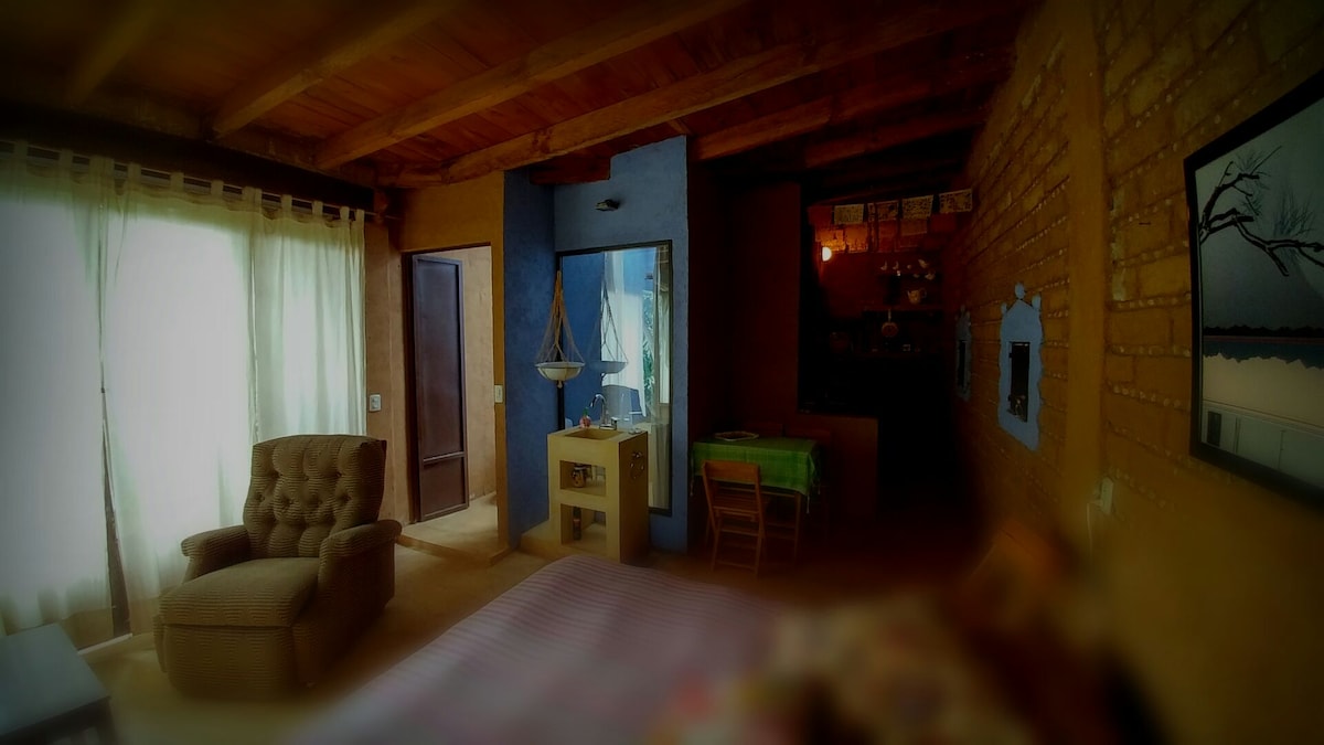 Cuarto independiente con baño privado. Al frente una terraza con vista al valle desde donde se puede contemplar el atardecer entre las montañas. Debido al clima del lugar la terraza es muy agradable para comer al exterior. A la pequeña cocina se accede desde allí. Existe un Eco filtro con agua dentro del cuarto/ se le agrega agua del grifo de la cocina.