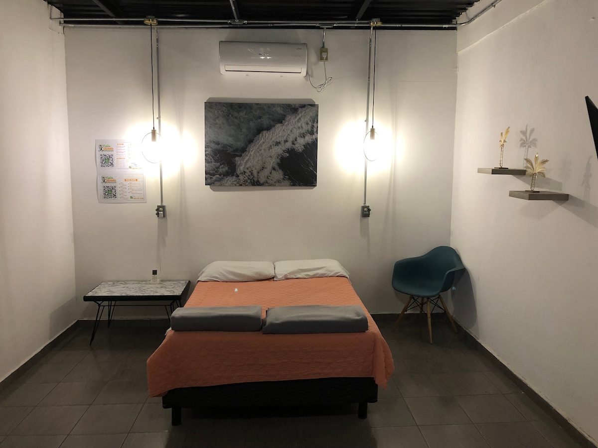 Encantador Loft pequeño, cómodo y acogedor con entrada independiente, ideal para descansar o disfrutar de la ciudad, cocina equipada para preparar tus comidas. Cuenta con wifi, minisplit, smartTV, 1 cama matrimonial y 1 sofá cama. A solo 1 minuto de las principales Plazas comerciales de la ciudad, Liverpool, Cines, Walmart, Starbucks, Caffenio, Little Caesars, Panamá. ¡Ubicación inmejorable! Estacionamiento para 1 auto PUERTA PRINCIPAL YA FUE PINTADA DE NEGRO Facturamos