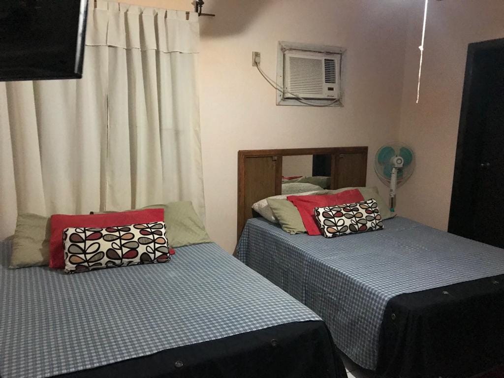 El departamento consta de dos habitaciones, una con una cama matrimonial y la otra con dos camas individuales, para llegar a la última habitación tienes que pasar por la primera, pero ambas constan de sus respectivas paredes y puertas para separarlas. En la cocinera, hay una barrita con 4 bancos, una parrilla eléctrica con dos quemadores, refrigerador, sartenes , platos, cubiertos, licuadora, microondas, cafetera, etc. Tiene un solo baño el cual tiene agua caliente. Cochera privada.