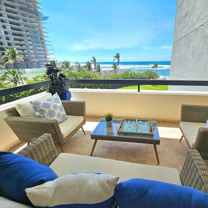 The interior of the apartment has no damage from OTIS and JOHN. Spacious 4-BR luxury beachfront apartment, EXCLUSIVE FOR FAMILIES, with a huge double balcony, stands out for its unbeatable view of the paradisiacal Acapulco Bay, large pool, and beach club. Includes daily maid service (hotel-style). 100 meters of beachfront with exclusive-use palapas, a pool with a slide, a wading area for kids, and restaurant/bar service. The 4 bedrooms have mini-splits and private bathrooms.