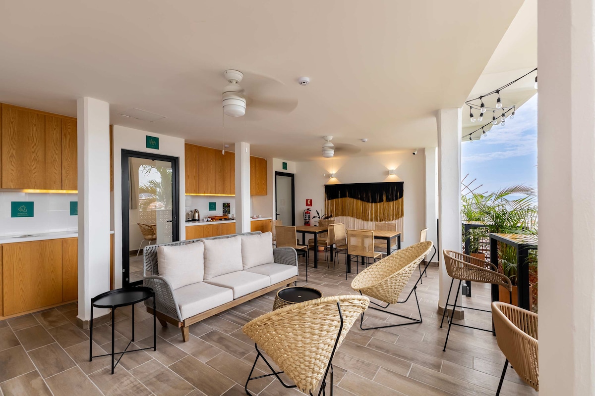 Raíces Nómadas, located in the heart of Puerto Vallarta, blends comfort, style, and functionality in one vibrant space. Perfect for both leisure and business travelers, the building features a rooftop terrace with stunning ocean views, ideal for watching the sunset. Guests can enjoy a shared kitchen, outdoor dining area, and meeting rooms designed for remote work and online meetings. Just steps from the beach, Raíces Nómadas offers the perfect base to experience the best of Vallarta.
