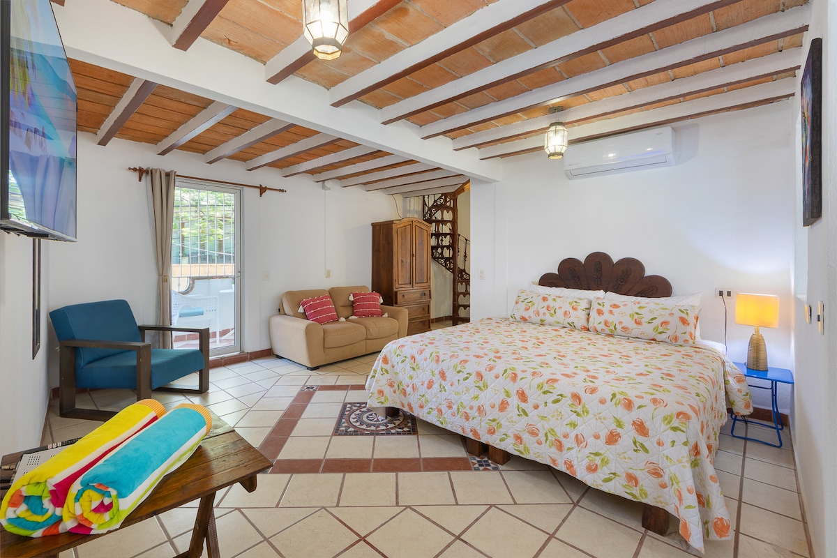 Experience the epitome of beachside living in the heart of PV, mere steps away from the renowned 'Los Muertos' beach. This ground-floor apartment offers accessibility with just a slight ascent of 2 small steps.Your apartment offers a sumptuous king-size bed, the bedroom is your haven for relaxation, equipped with AC for your comfort and a TV featuring different channels in the living room and bedroom. Stay effortlessly connected with Wi-Fi, and savor the convenience of a fully equipped kitchen.